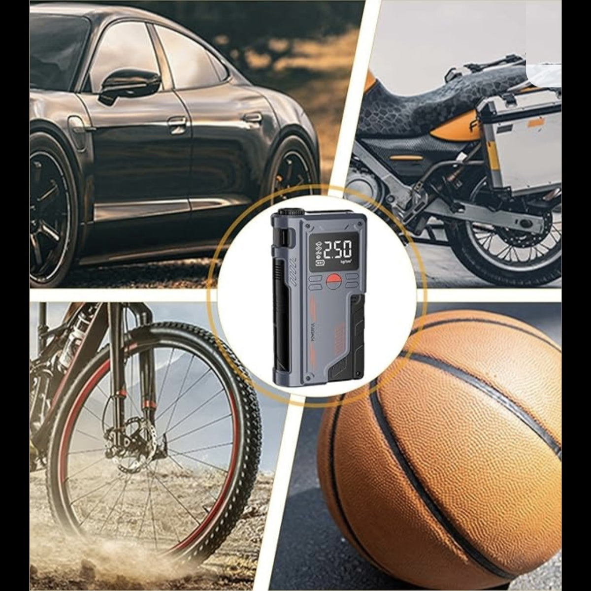 Inflate car tires, motorcycle wheels, bicycle tires, footballs, and inflatables in minutes. The smart digital LCD display shows real-time pressure in PSI or Bar so you never over-inflate.