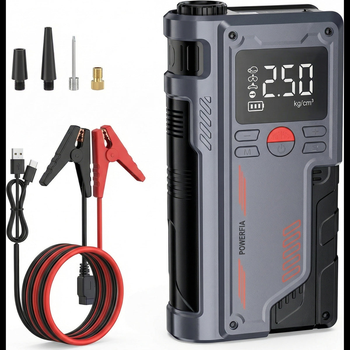 Comes with jump starter clamps, inflation nozzles for all valve types, USB charging cable, and a premium carry case — ready to use straight out of the box.